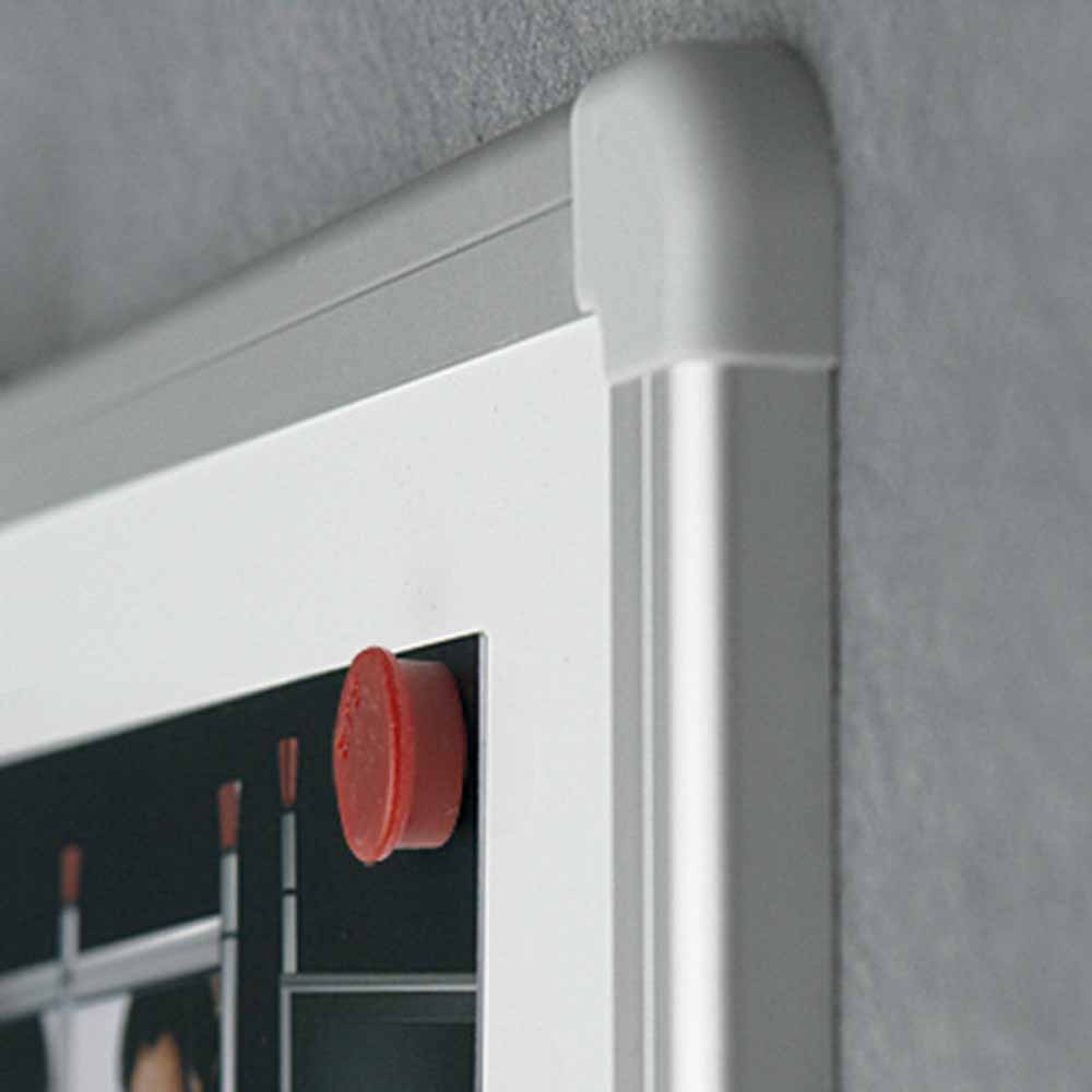 Tablica została osadzona w ramie z profilu aluminiowego w kolorze srebrnym, wykończonej popielatymi narożnikami, które dodają jej elegancji. Wytrzymała konstrukcja gwarantuje stabilność, a nowoczesny wygląd sprawia, że doskonale wpisuje się w każde wnętrze.