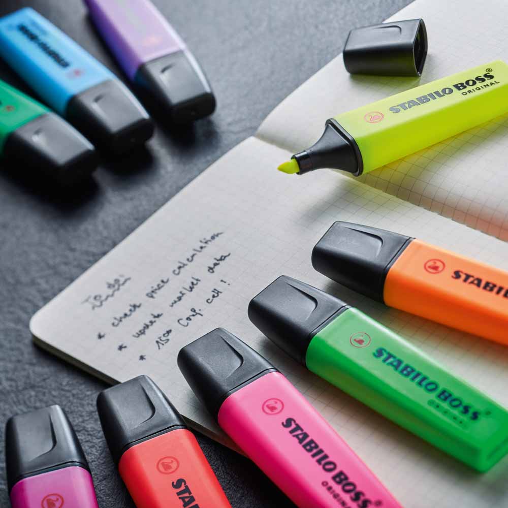 Zakreślacze STABILO BOSS ORIGINAL to legenda wśród zakreślaczy, cieszące się niesłabnącą popularnością od ponad pięciu dekad. Dostępne w zestawie sześciu intensywnych kolorów, umożliwiają tworzenie barwnych, wyrazistych notatek.