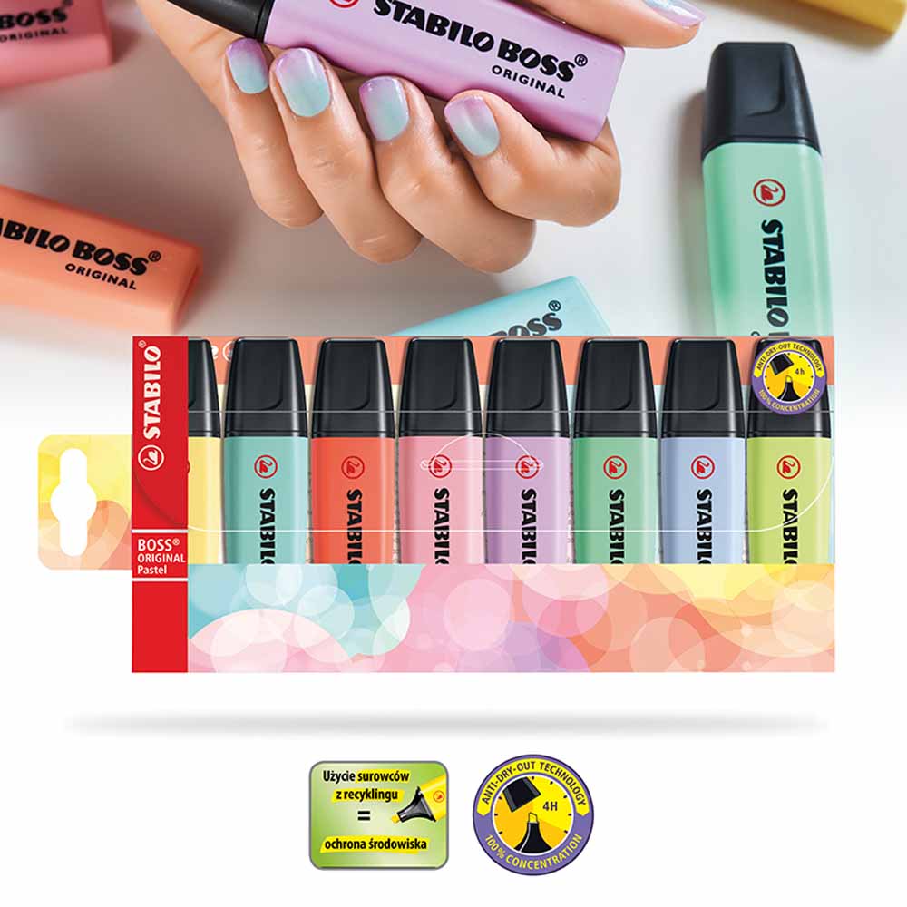 STABILO BOSS ORIGINAL dba o środowisko - wszystkie czarne elementy zakreślacza wykonane są z plastiku pochodzącego z recyklingu. Zakreślacz jest również łatwy do ponownego napełnienia, co redukuje ilość odpadów.