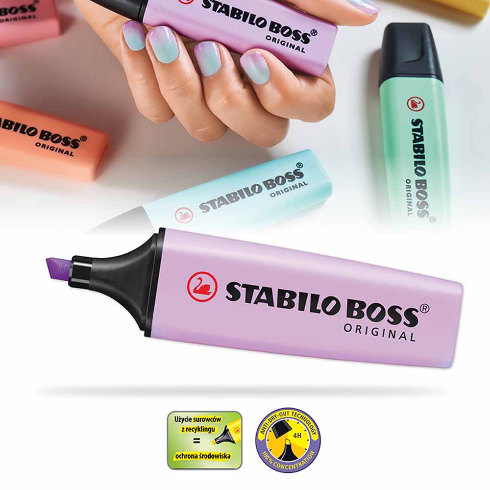 STABILO BOSS ORIGINAL dba o środowisko - wszystkie czarne elementy zakreślacza wykonane są z plastiku pochodzącego z recyklingu. Zakreślacz jest również łatwy do ponownego napełnienia, co redukuje ilość odpadów.