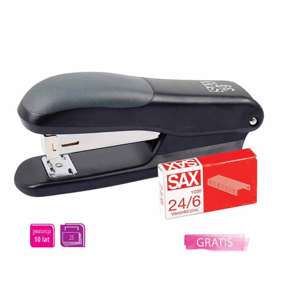 Dziurkacz SAX318 wykonuje dwie dziurki o średnicy 5,5 mm, z odstępem 80 mm między nimi, co jest idealnym rozwiązaniem dla standardowych dokumentów. Produkt posiada certyfikat bezpieczeństwa GS oraz 10-letnią gwarancję, co potwierdza jego niezawodność i wysoką jakość.