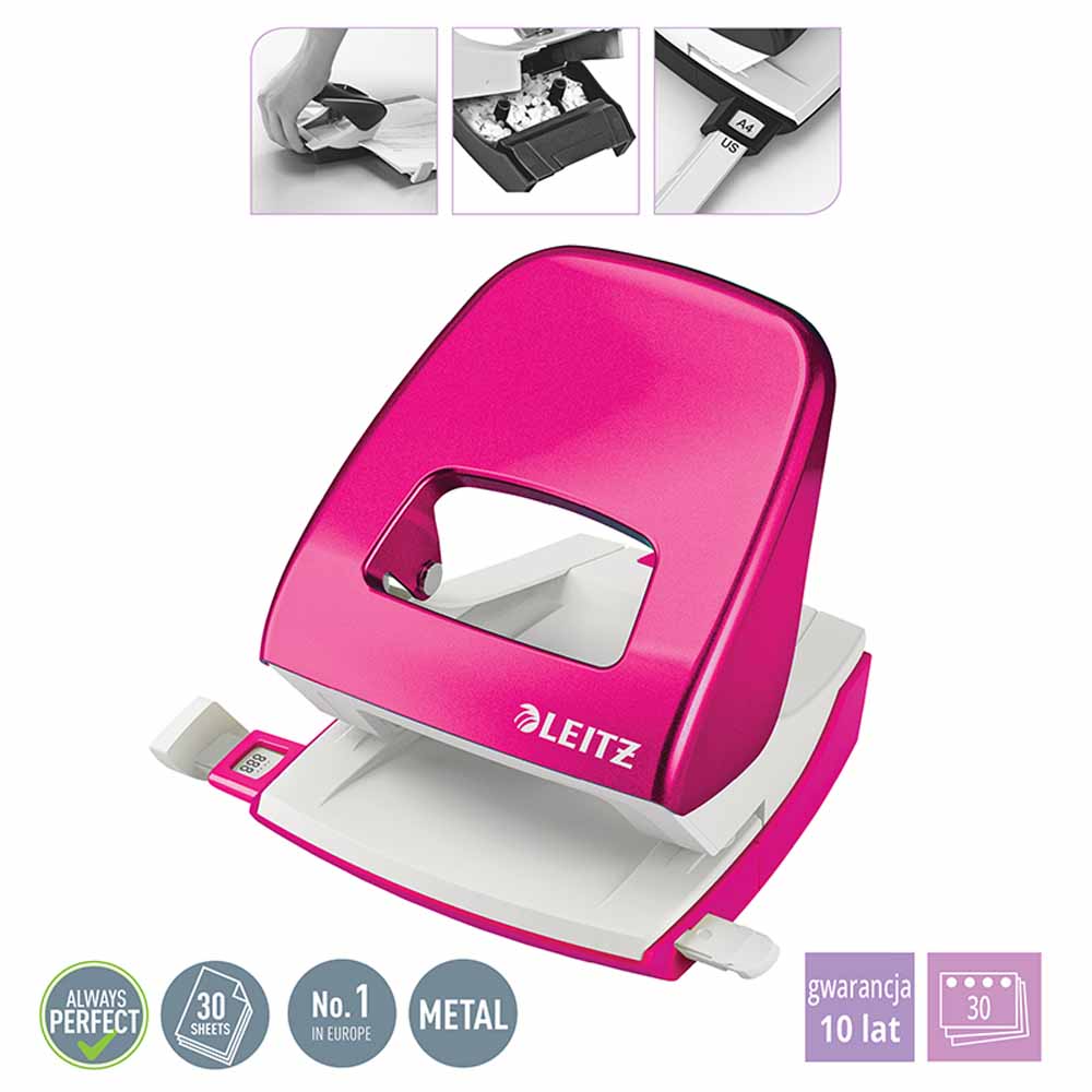 Dziurkacz posiada zaawansowany ogranicznik formatu z podglądem, który umożliwia precyzyjne dostosowanie dziurkowania do różnych formatów: A4, US, A5, F3x8, A6, 3x8. Dodatkowe wgłębienia w tylnej części podstawy są zgodne z rozstawem ringów w segregatorze, co pozwala na szybkie dziurkowanie bez konieczności używania listwy formatowej. Wskaźnik środka strony oraz łatwy do otwierania pojemnik na ścinki zapewniają wygodę i czystość w miejscu pracy.