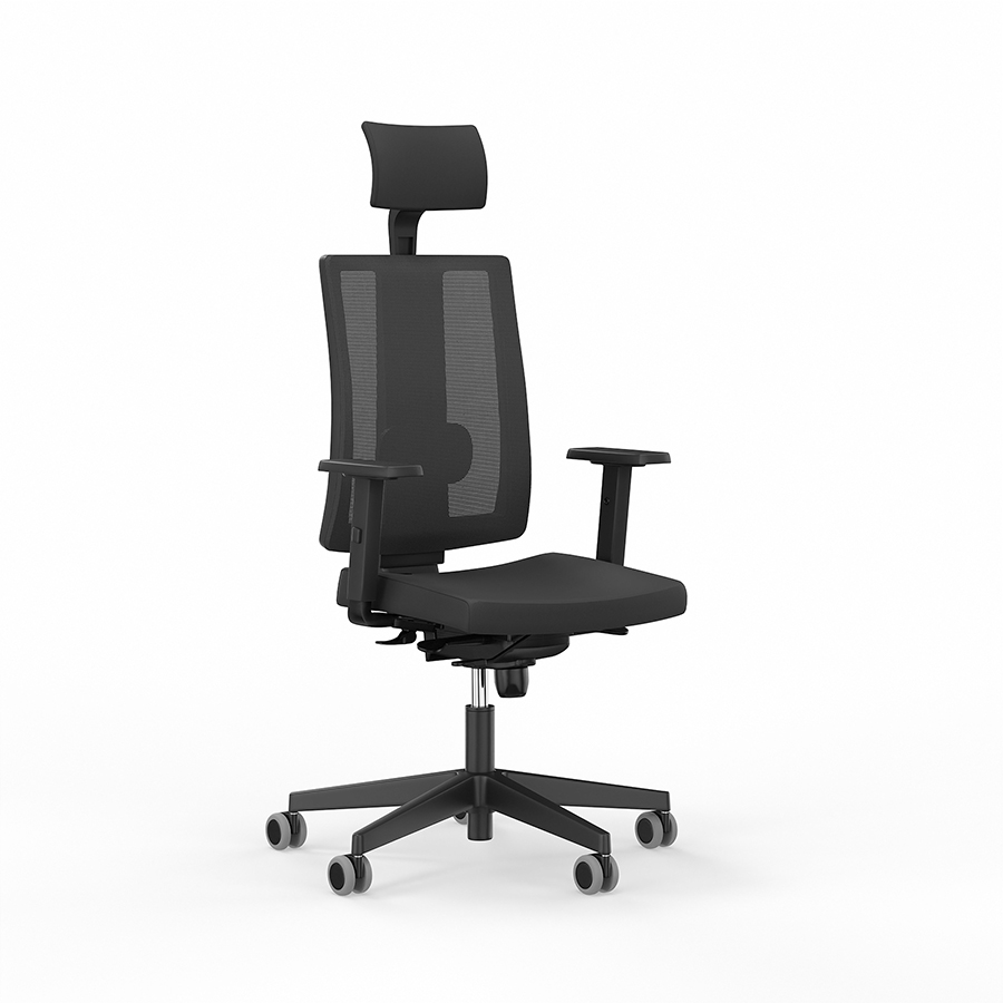 obrotowy fotel biurowy z wygodnym oparciem i zagłówkiem miękkie, wypełnione pianką siedzisko mechanizm motylkowy (TILT) dający możliwość swobodnego kołysania oraz blokady pozycji do pracy zagłówek stały o rozmiarze 26,5 x 17,5 cm stałe podparcie lędźwiowego odcinka kręgosłupa podłokietniki plastikowe zapewniająca stabilność pięcioramienna, stalowa, chromowana podstawa podnośnik gazowy (siłownik): 100 mm, chromowany kółka nylonowe, twarde, do wszystkich typów podłóg - średnica 50 mm materiał: ekoskóra wysokość krzesła: 117- 127 cm regulacja wysokości siedziska w zakresie: 47 – 57 cm szerokość oparcia: 51 cm wysokość oparcia: 76 cm szerokość siedziska: 51 cm głębokość siedziska: 46 cm średnica podstawy: 68 cm maksymalne obciążenie: 100 kg rekomendowany czas siedzenia: do 8 godzin dziennie gwarancja: 2 lata kolor: czarny