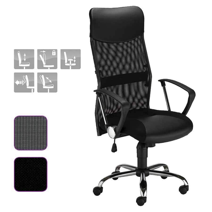 wygodny, kompaktowy fotel biurowy pokryty tkaniną membranową miękkie, wypełnione pianką siedzisko i oparcie mechanizm motylkowy (TILT) dający możliwość swobodnego kołysania oraz blokady pozycji do pracy stałe podparcie lędźwiowego odcinka kręgosłupa podłokietniki z tworzywa zapewniająca stabilność pięcioramienna, podstawa podnośnik gazowy (siłownik): 100 mm kółka nylonowe, twarde, do wszystkich typów podłóg - średnica 50 mm materiał: tkanina poliestrowa wysokość krzesła: 106,5 - 118,5 cm regulacja wysokości siedziska w zakresie: 43,5 – 55,5 cm szerokość oparcia: 51 cm wysokość oparcia: 67 cm szerokość siedziska: 51,5 cm głębokość siedziska: 47 cm średnica podstawy: 64 cm maksymalne obciążenie: 90 kg rekomendowany czas siedzenia: do 6 godzin dziennie gwarancja: 2 lata kolor: czarny