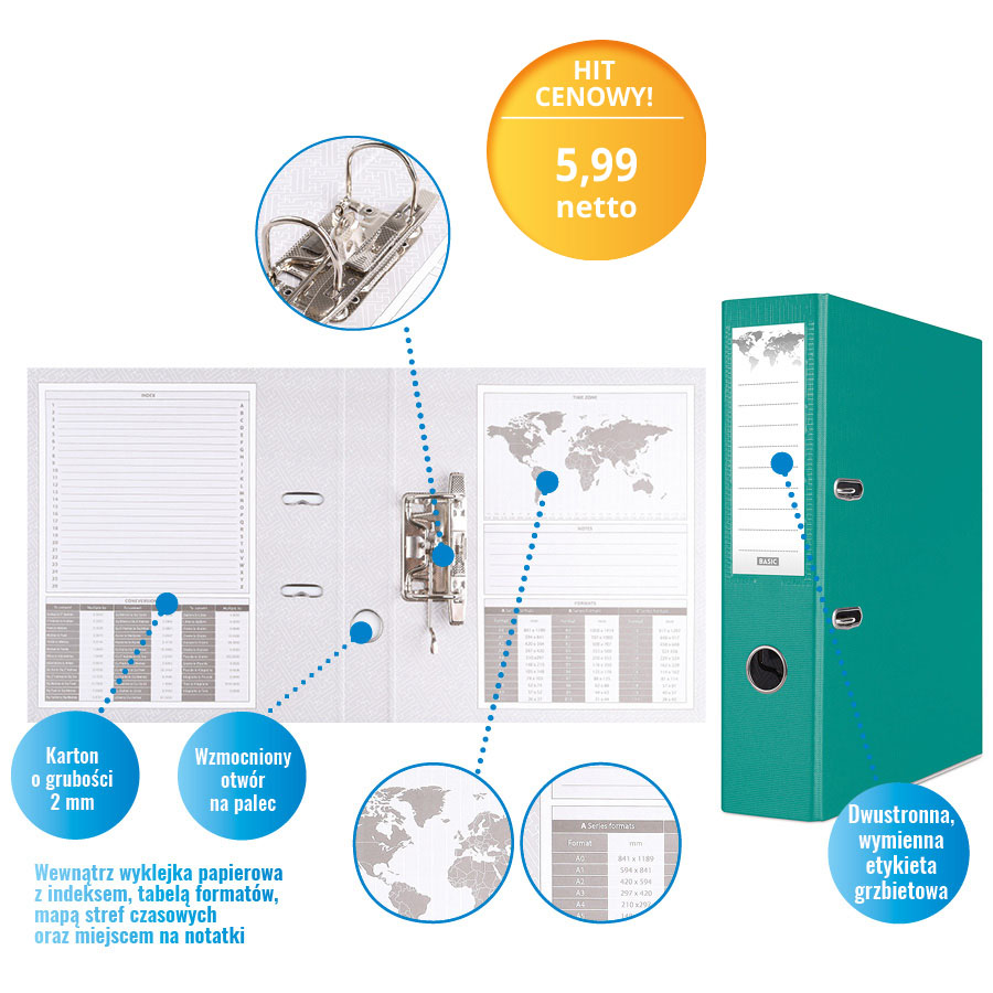 Wewnątrz znajduje się papierowa wyklejka z przydatnymi informacjami, takimi jak indeks, tabela formatów, mapa stref czasowych oraz miejsce na notatki. Dodatkowe udogodnienia to dolna listwa wzmacniająca, wzmocniony otwór na palec oraz dwustronna, wymienna etykieta grzbietowa, ułatwiająca identyfikację zawartości.