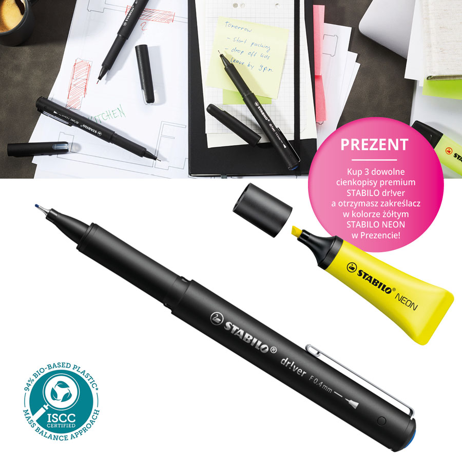 Najwyższej klasy cienkopis STABILO dr!ver zapewnia wyjątkową precyzję i komfort użytkowania. Doskonale sprawdzi się do pisania, rysowania, podkreślania oraz pracy z linijką. Wyposażony w mocną, metalową końcówkę, gwarantuje trwałość i niezawodność aż do całkowitego wyczerpania tuszu.