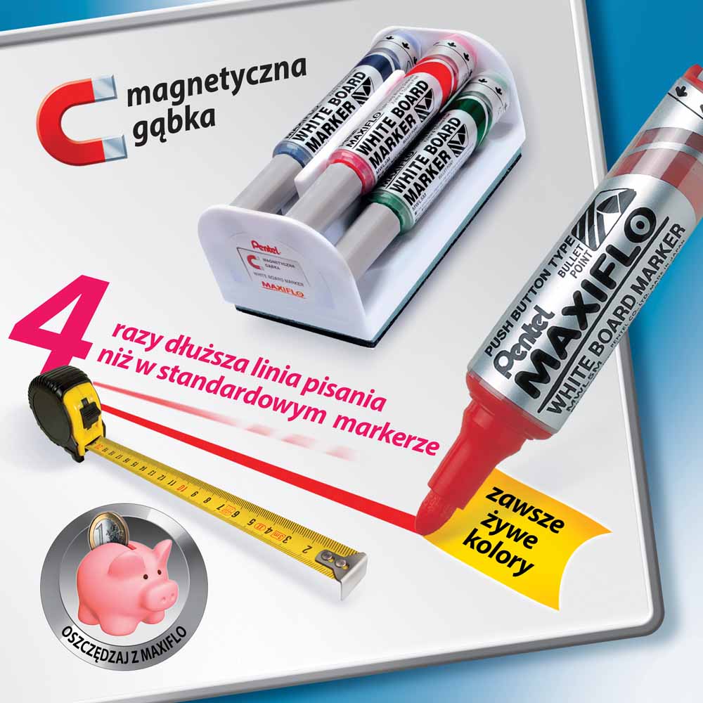Wyraźne kolory tuszu i łatwość ścierania sprawiają, że markery Pentel MWL5S Maxiflo są idealnym narzędziem do codziennego użytku na tablicach suchościeralnych. Niezależnie od koloru, tusz zawsze wygląda intensywnie i jest łatwy do usunięcia.